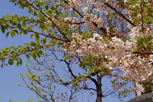染井吉野櫻已經是半謝狀態,但另一種較豔麗的櫻花品種正在盛開中。